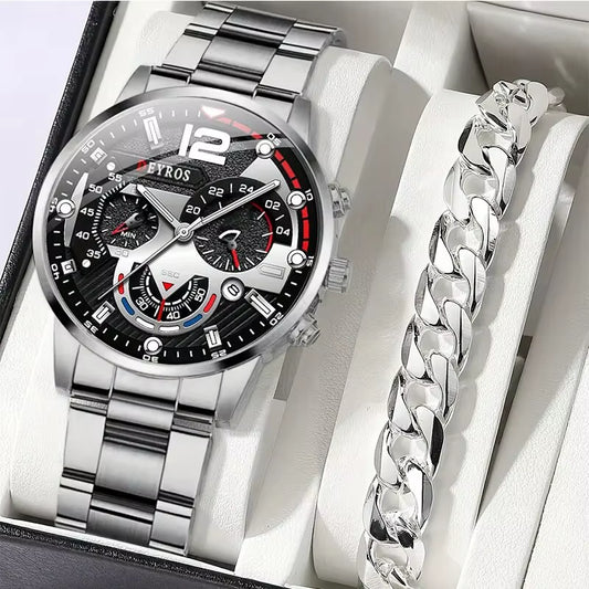2Pcs Luxury Mens Silver Quartz Watch with Stainless Steel Bracelet Men Fashion Business Casual Watch Luminous Clock