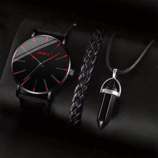 3Pcs Set Fashion Mens Watches Luxury Casual Leather Quartz Wristwatch Men Business Sports Wrist Watch Bracelet Necklace Set